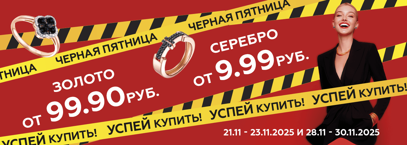 Ювелирная Черная пятница уже началась! Украшения из серебра от 9,99 рублей, а украшения из золота от 99,9 рублей! А также дополнительные скидки до 20% (+ к скидке укаанной в карточке товара) на выделенный ассортимент, даже на эксклюзивные модели с бриллиантами! Всего шесть дней!