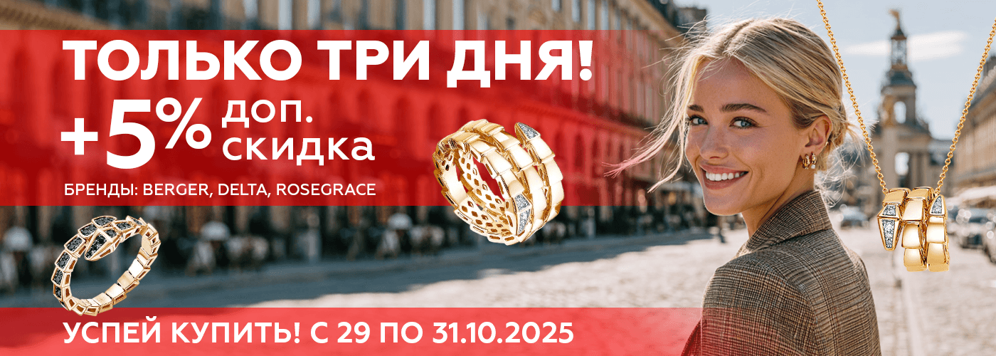 Только три дня дополнительных скидок 5% на покупку роскошных украшений от известных брендов Rose Grace, DELTA и Berger! Стильные, трендовые модели из золота и серебра с драгоценными вставками, а также модели в стиле известных брендов!